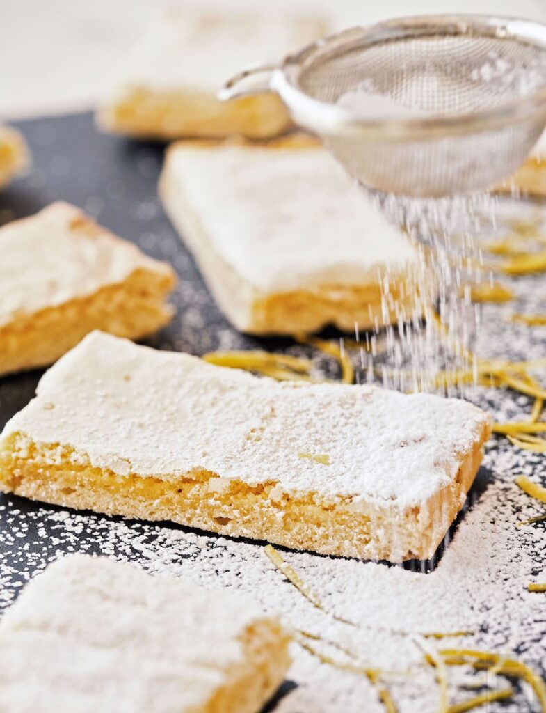 - Den ausgekühlten Zitronenkuchen in Bars (Schnitten) in beliebiger Größe schneiden. Vor dem Servieren mit Puderzucker bestäuben und mit Zitronenzesten dekorieren.